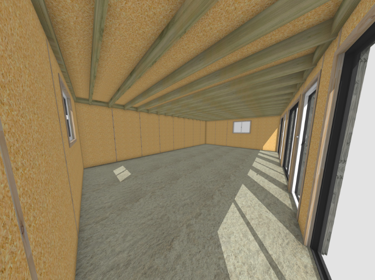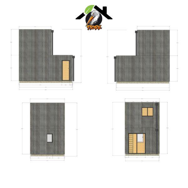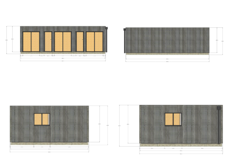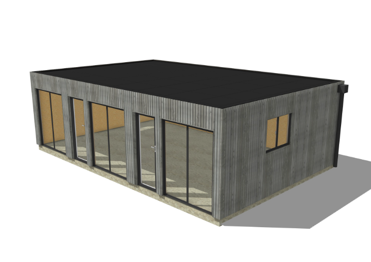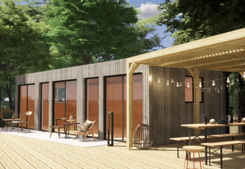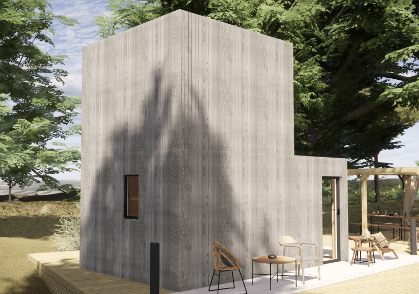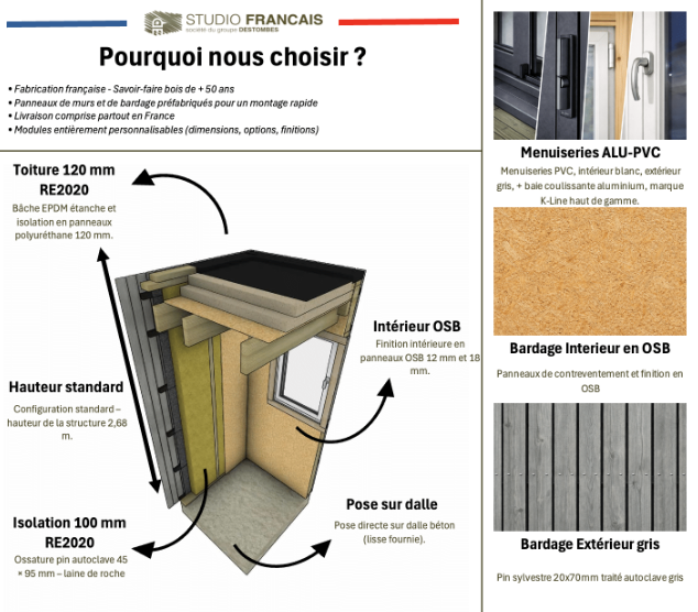 Structure : Ossature bois 45×95 mm – isolation RE2020Finition intérieure : OSB 12Bardage : Bardage vertical ajouré 20×70 grisMenuiseries : Aluminium (baie coulissante)